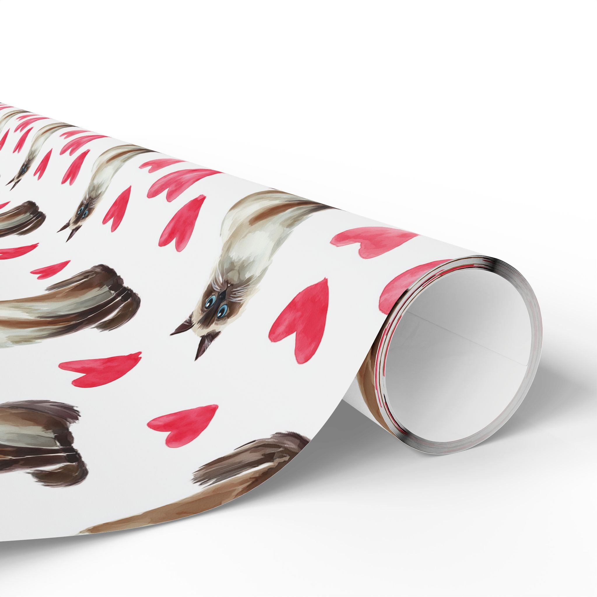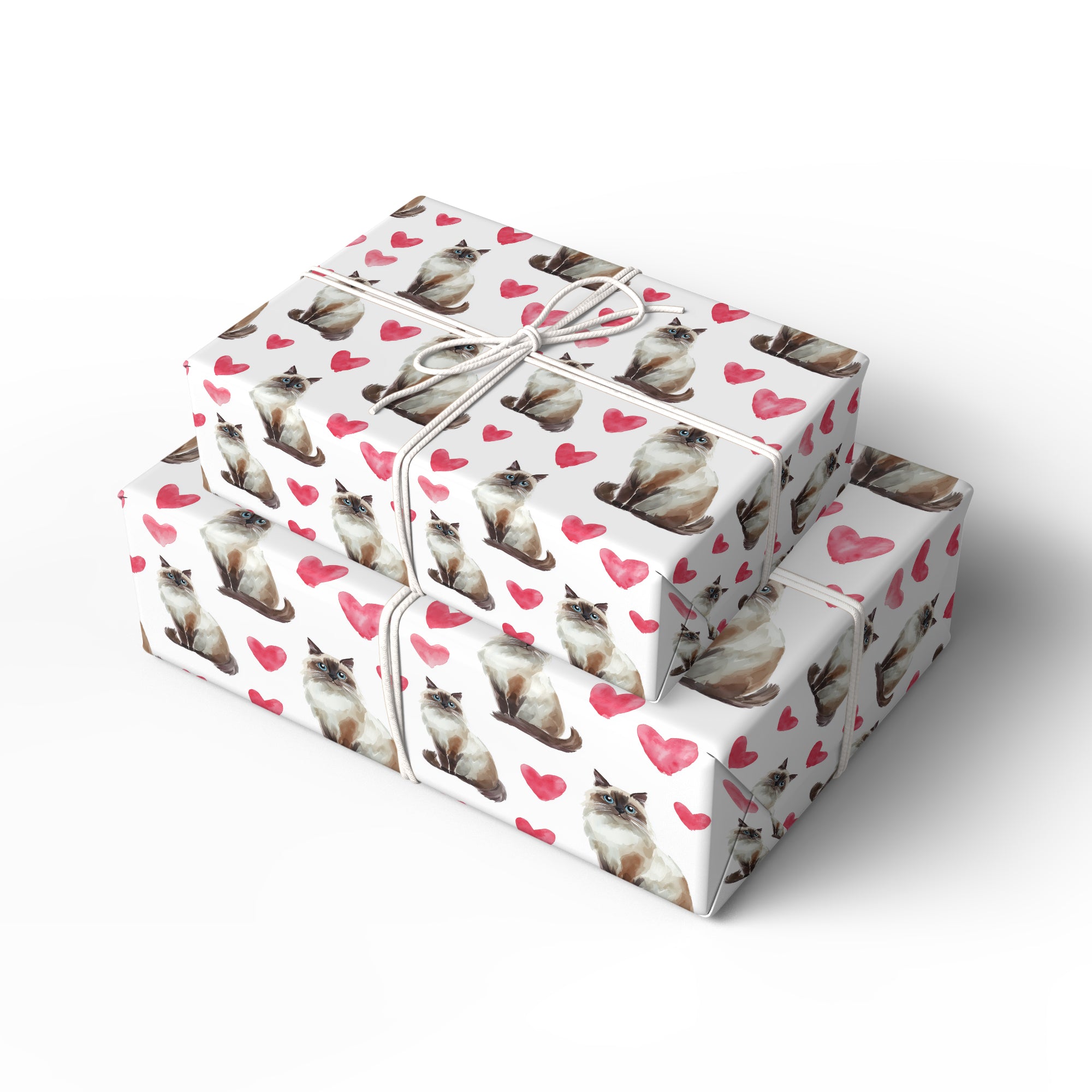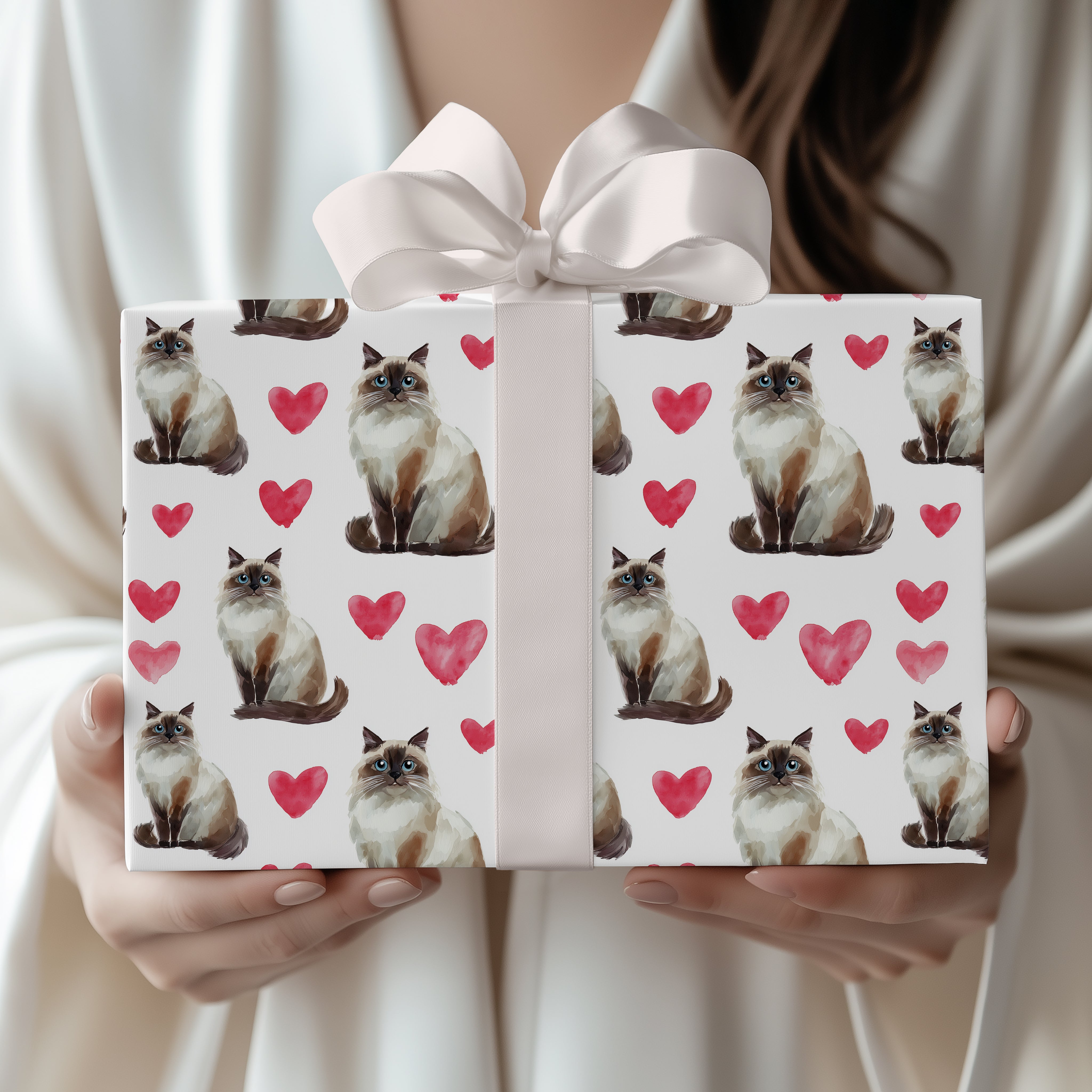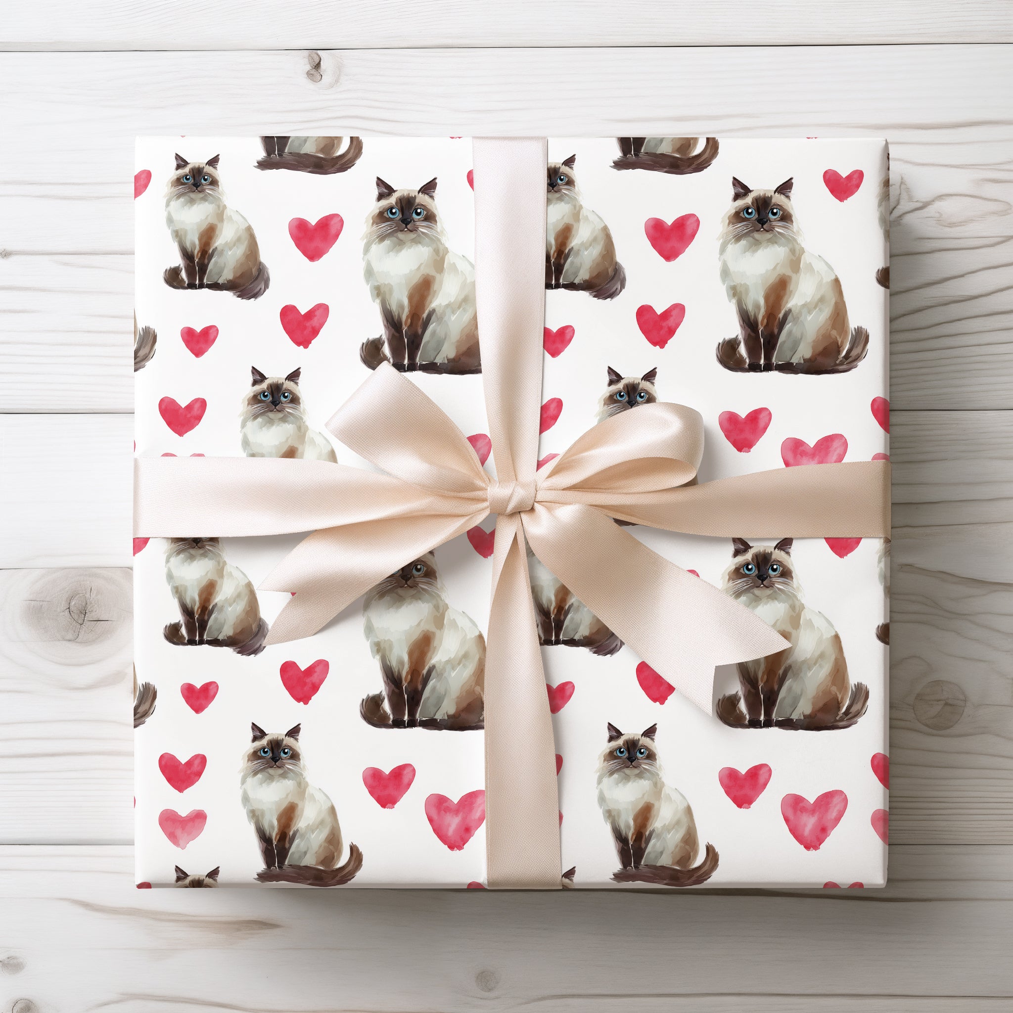 Cloudpurr Romance – Watercolor Birman Cat with Soft Red Hearts Wrapping paper