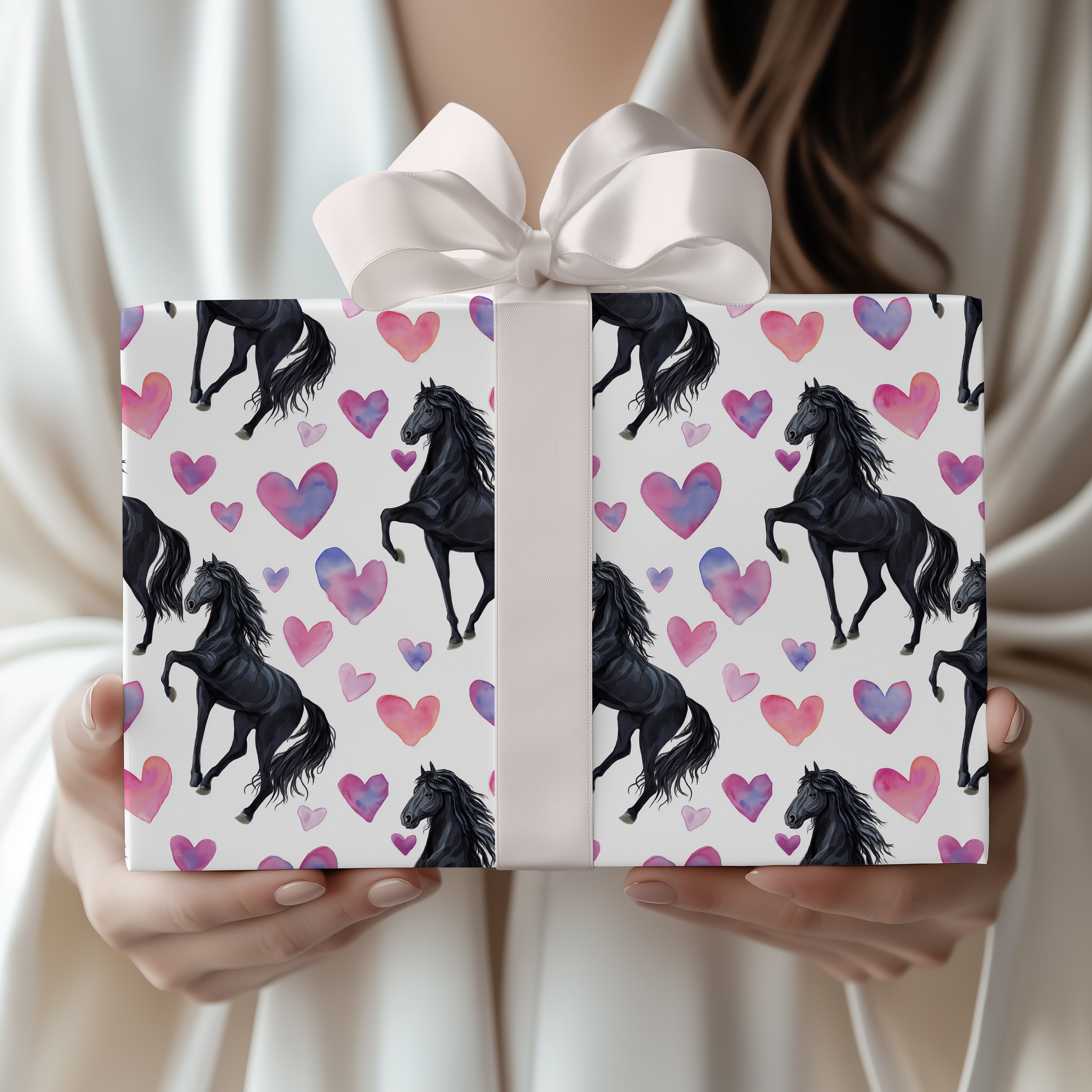 Grace Gallop – Majestic Black Horse with Purple-Pink Hearts wrapping paper