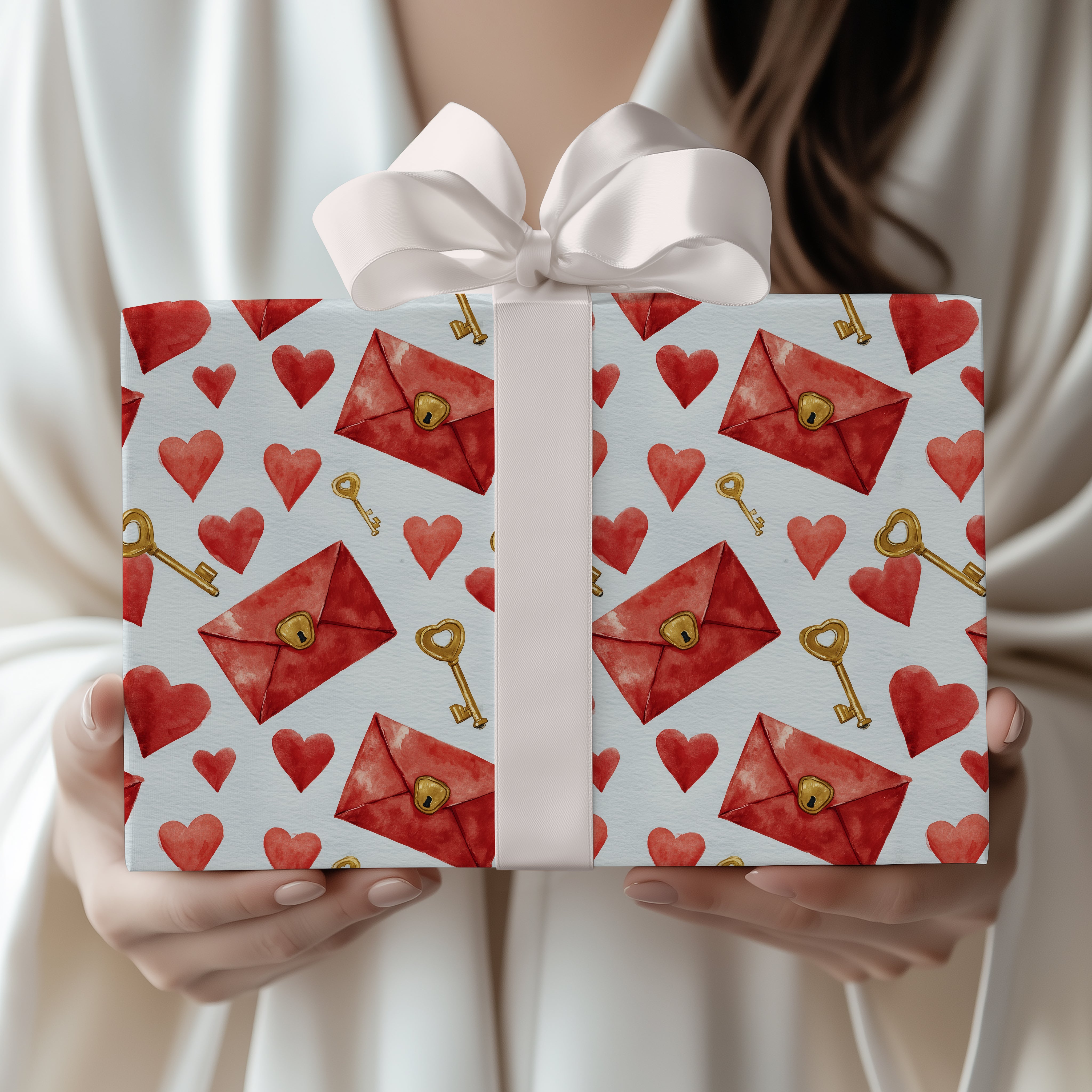 Heartkey Whispers – Watercolor hearts, keys, and envelopes pattern wrapping paper