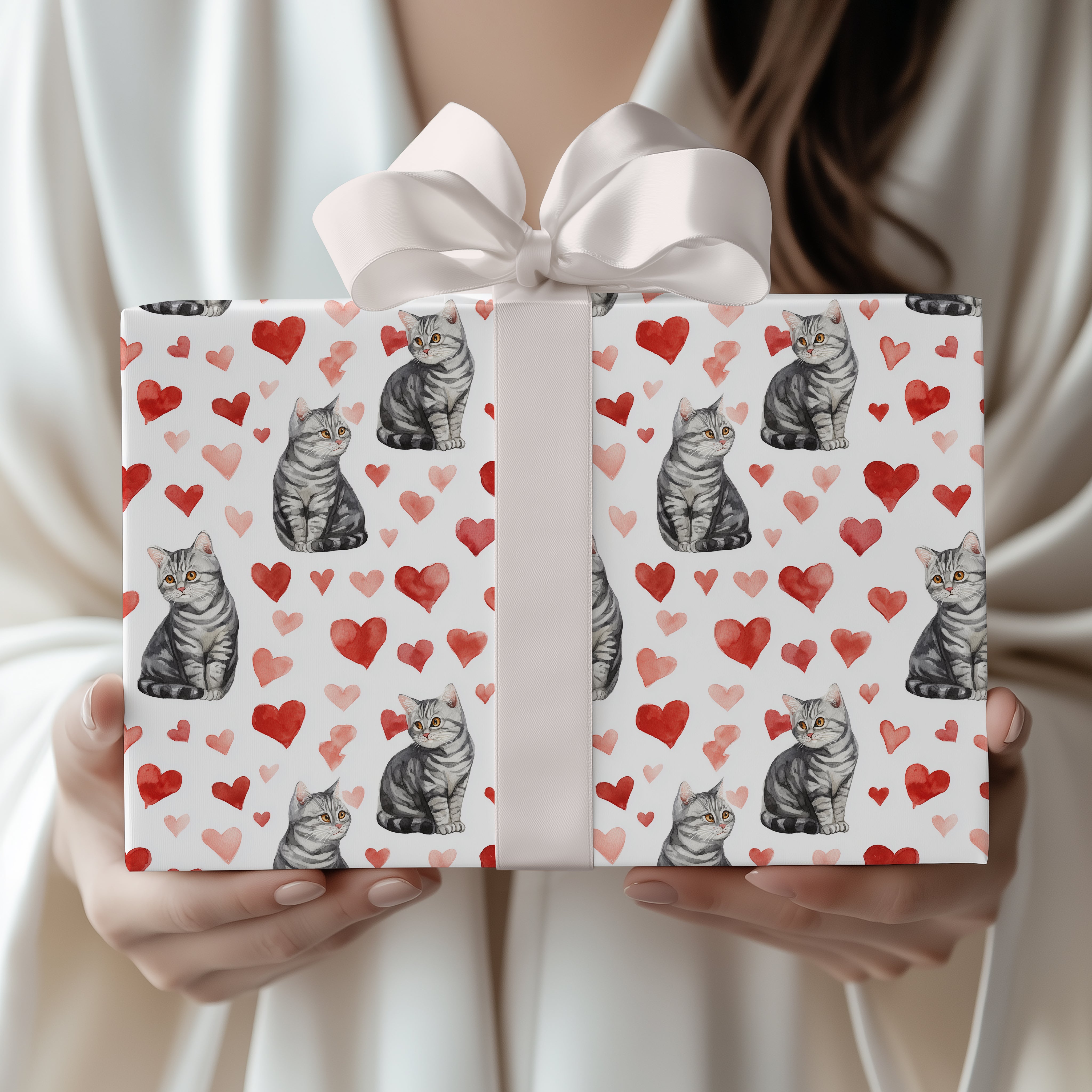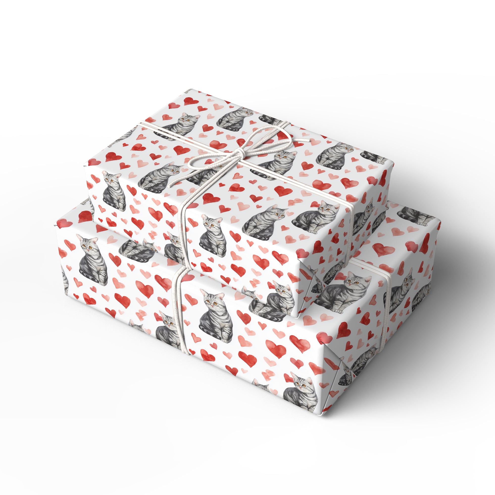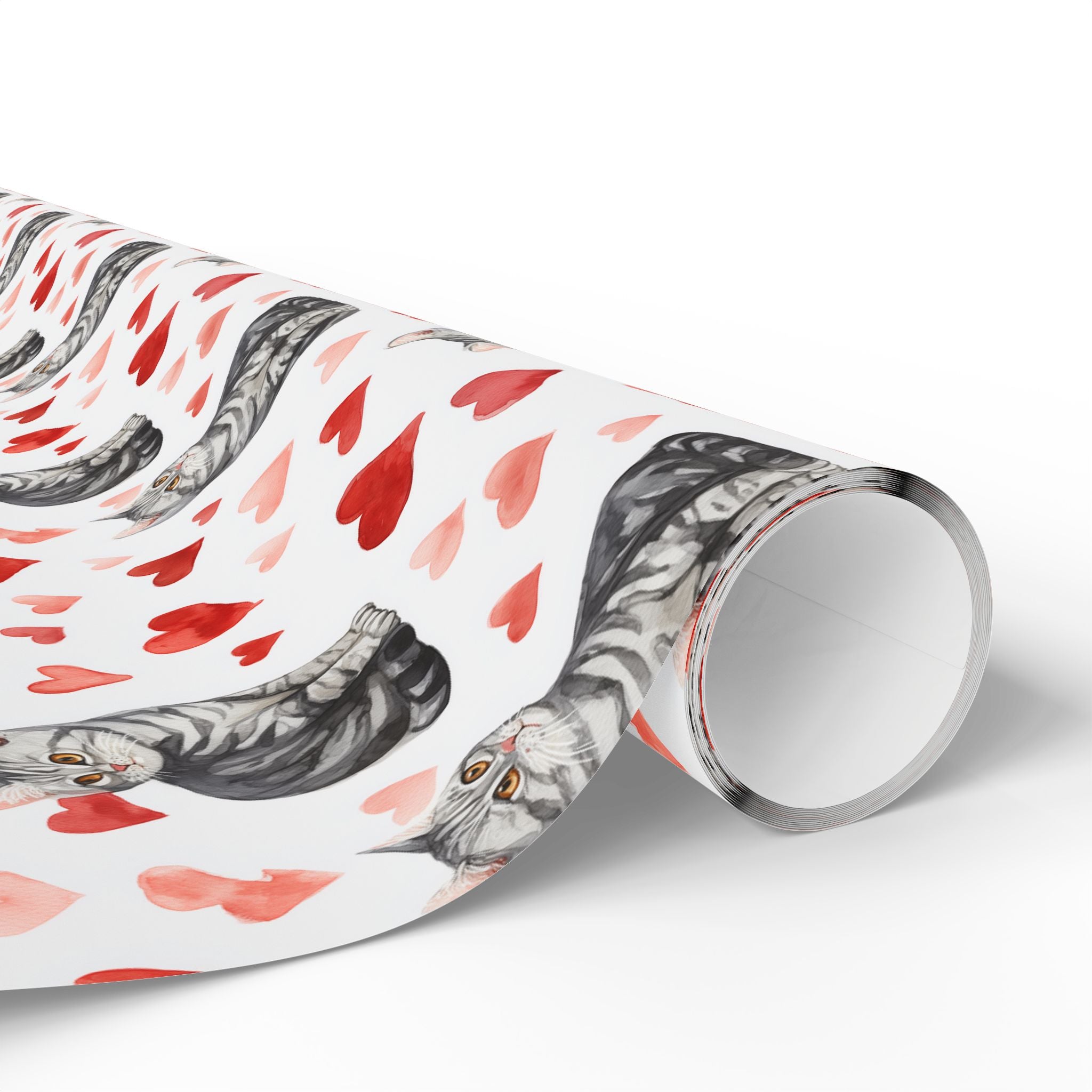 Heartwhisk Muse – Watercolor American Shorthair Cat with Red Hearts Wrapping Paper