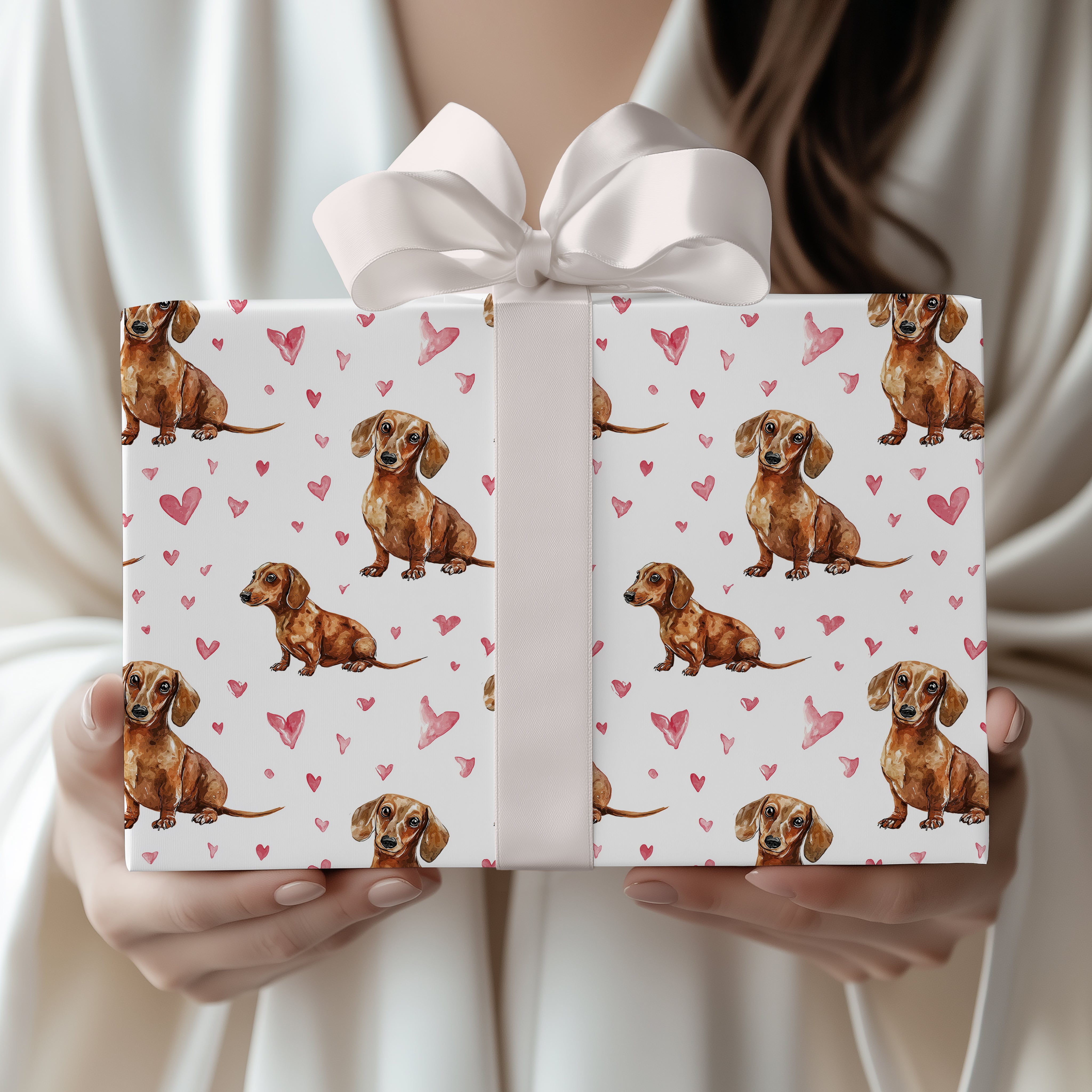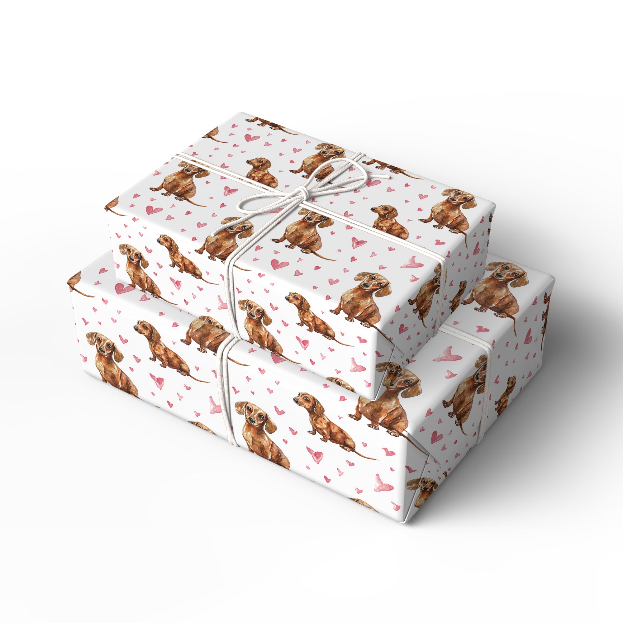 Hopkin Cuddlefluff – Sitting Dachshund Puppies and Pink Hearts wrapping paper