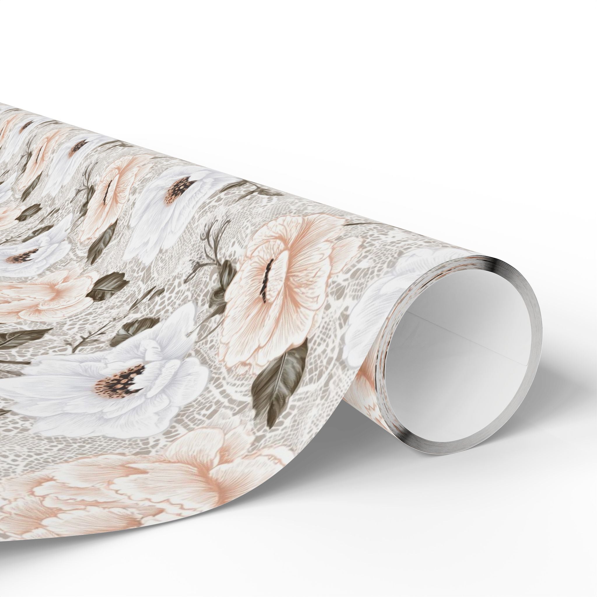 LaceBloom – White Peonies and Anemones on Lace-Inspired Neutral Background Wrapping Paper