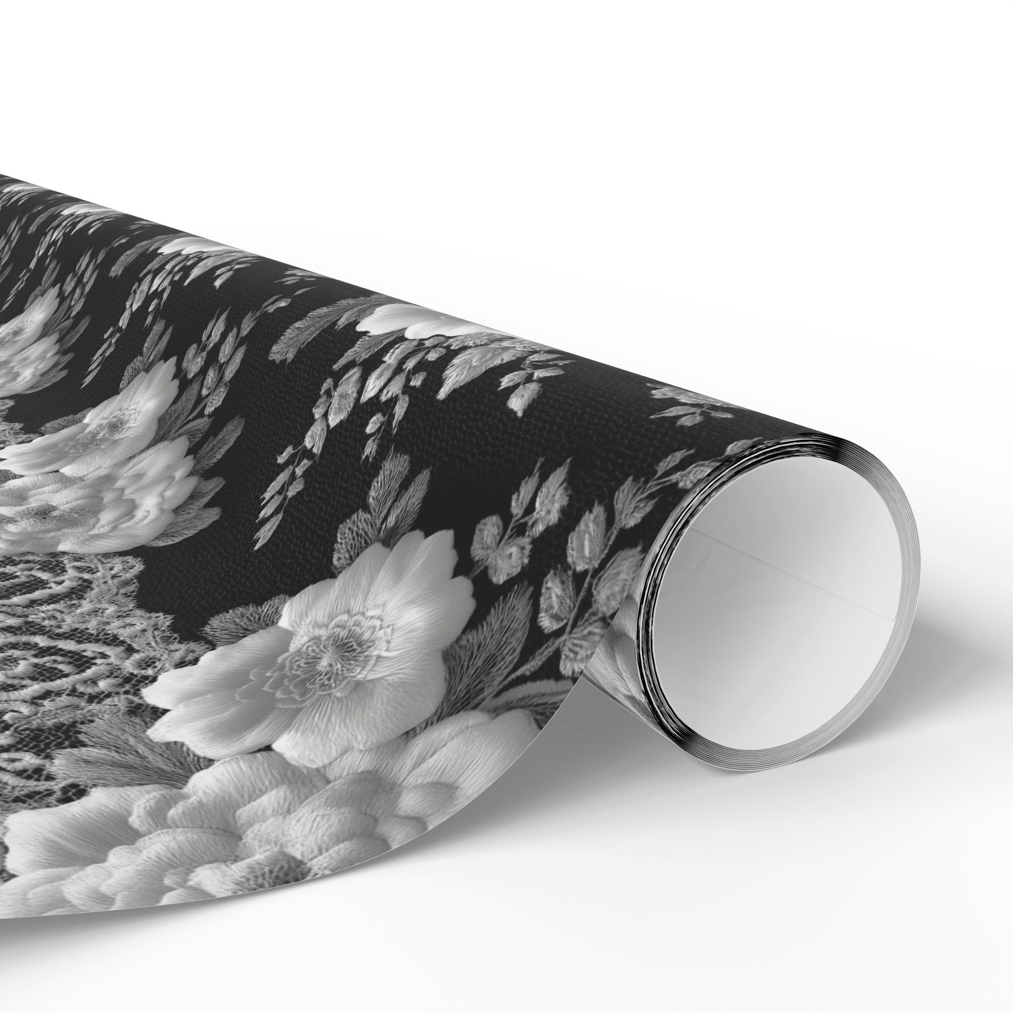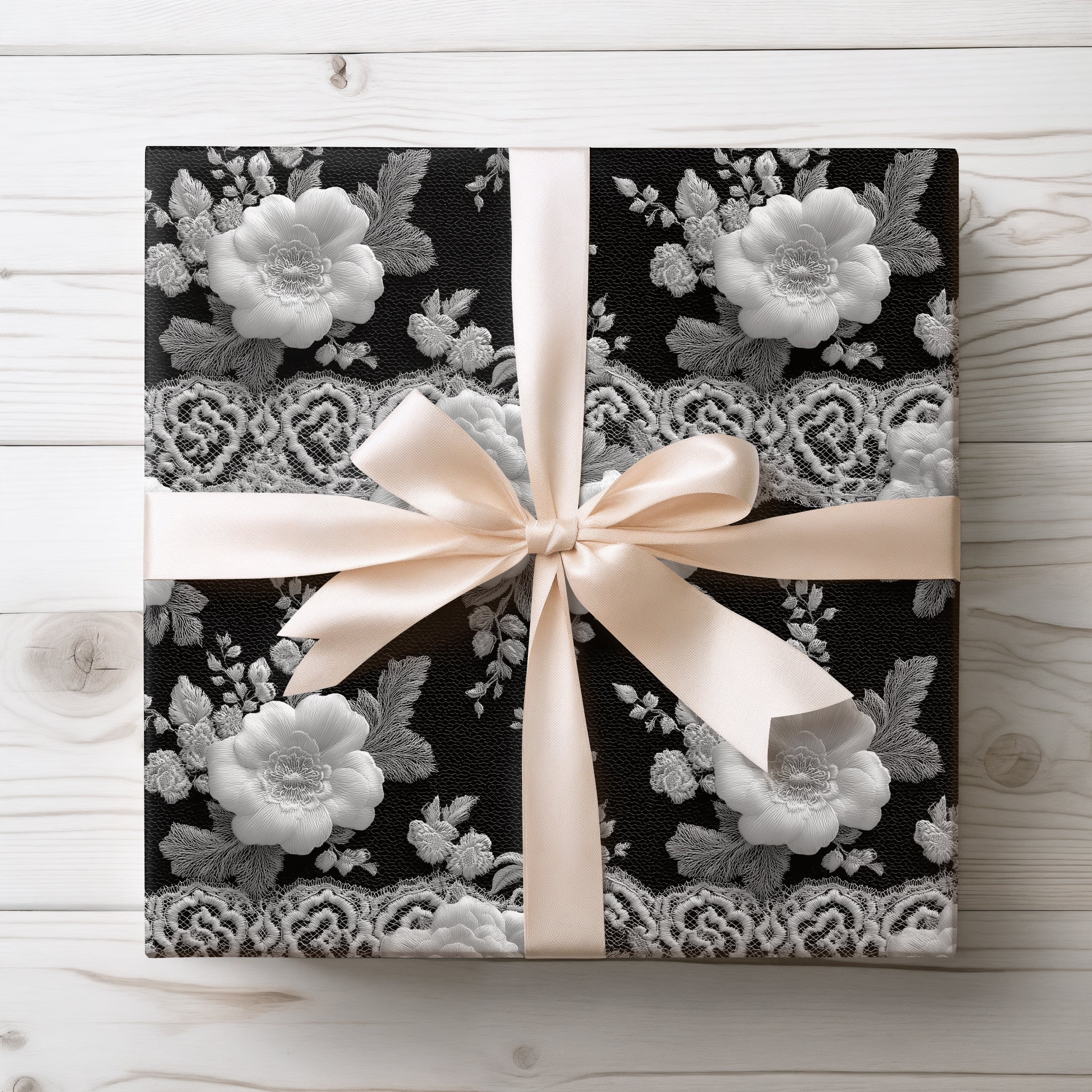 Midnight Blossom Veil - Exquisite Black and White Lace Floral Wrapping Paper