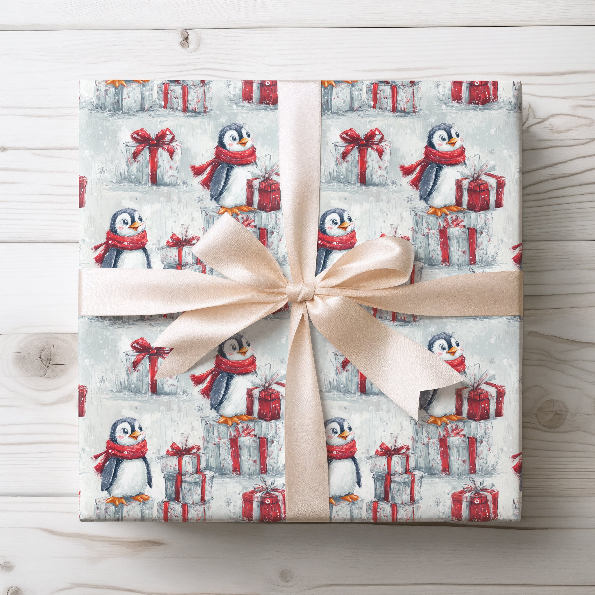 NorthPole Penguin – Cute Penguin Christmas Wrapping Paper with Red Scarf and Presents