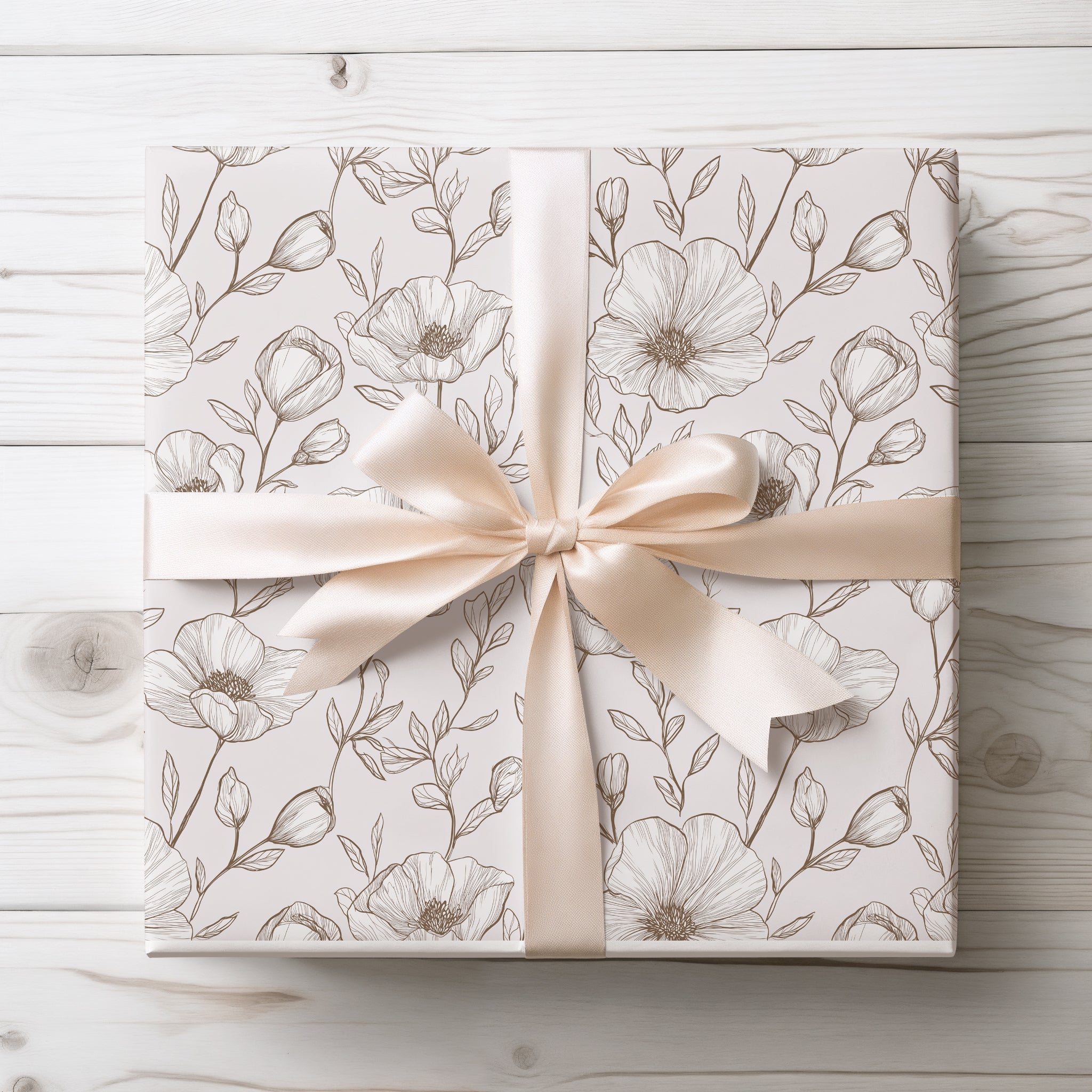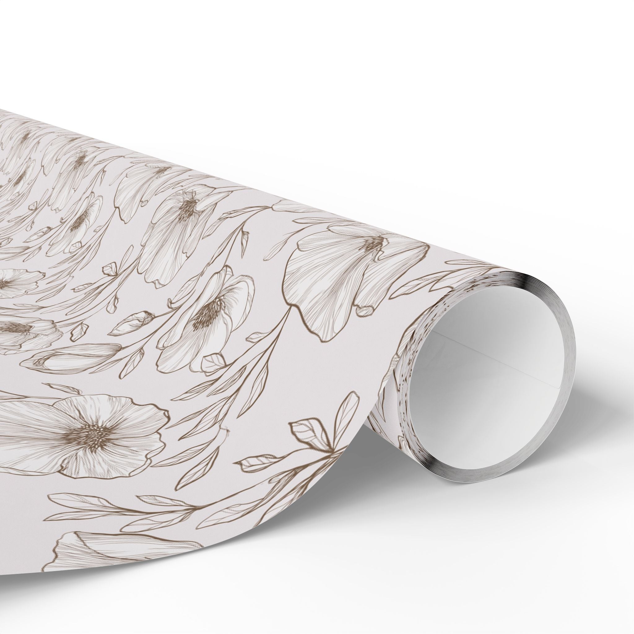 PetalInk – Brown Fine Line Poppies and Leaves on Blush Background Wrapping Paper