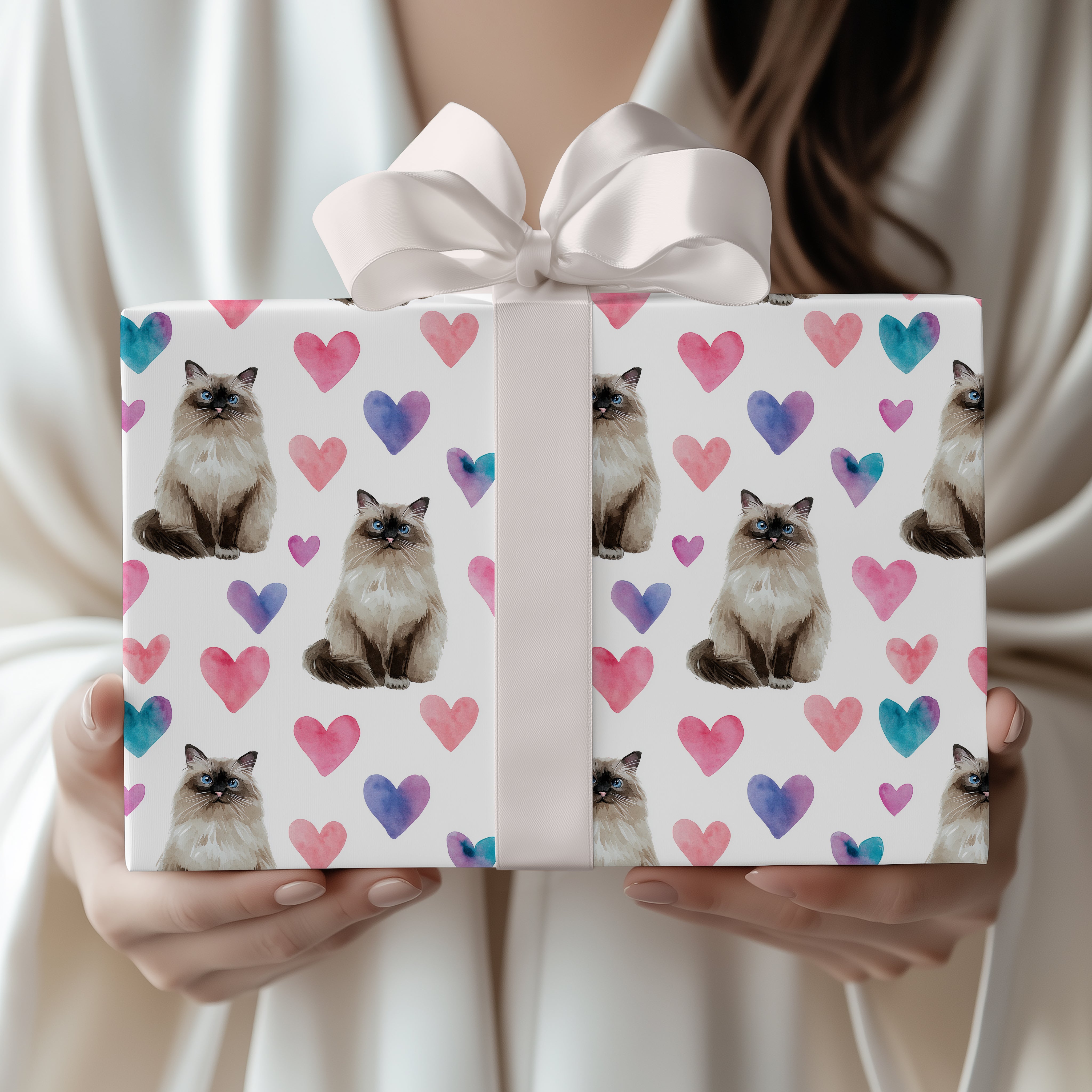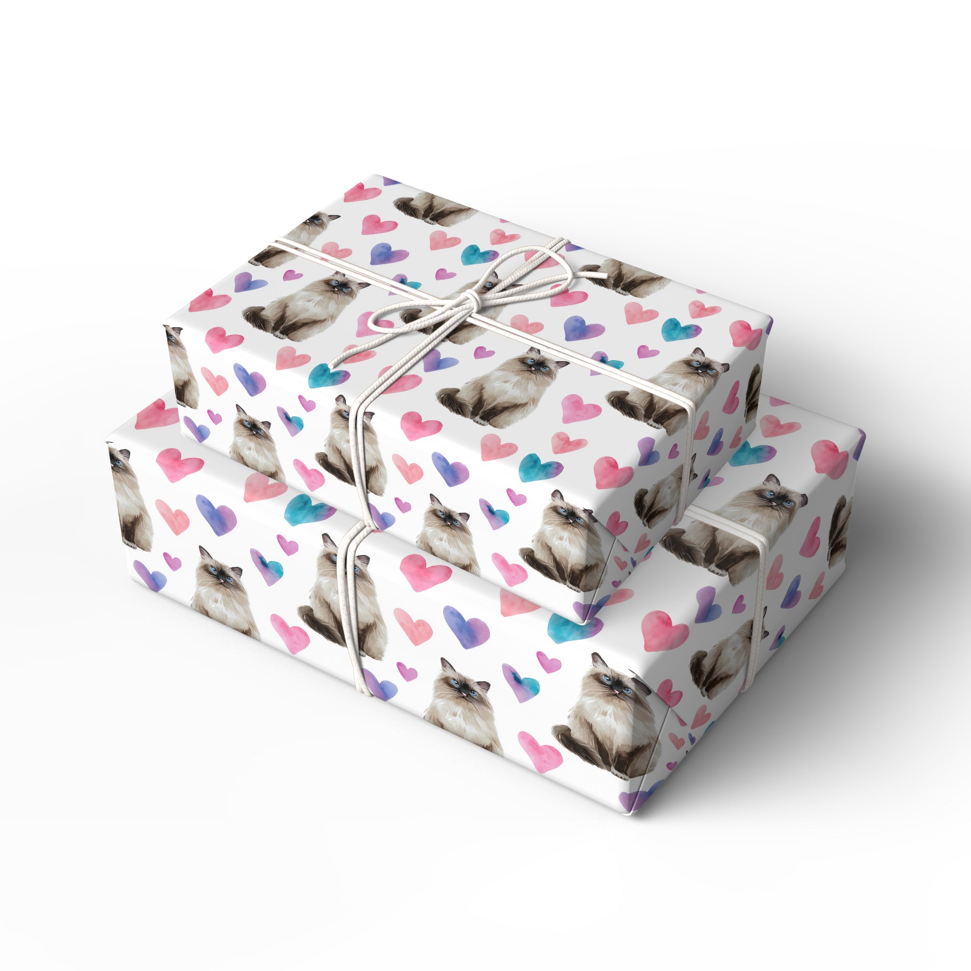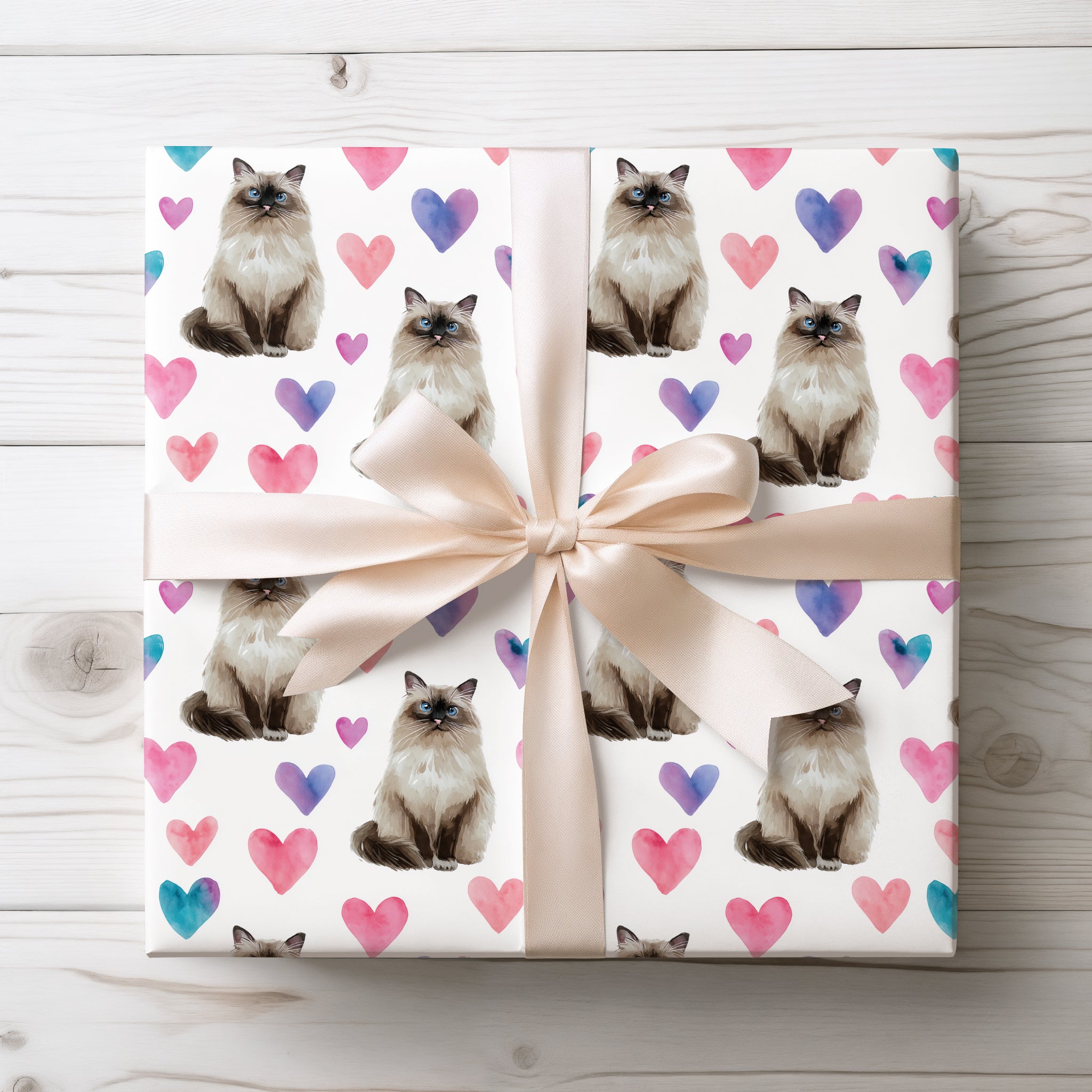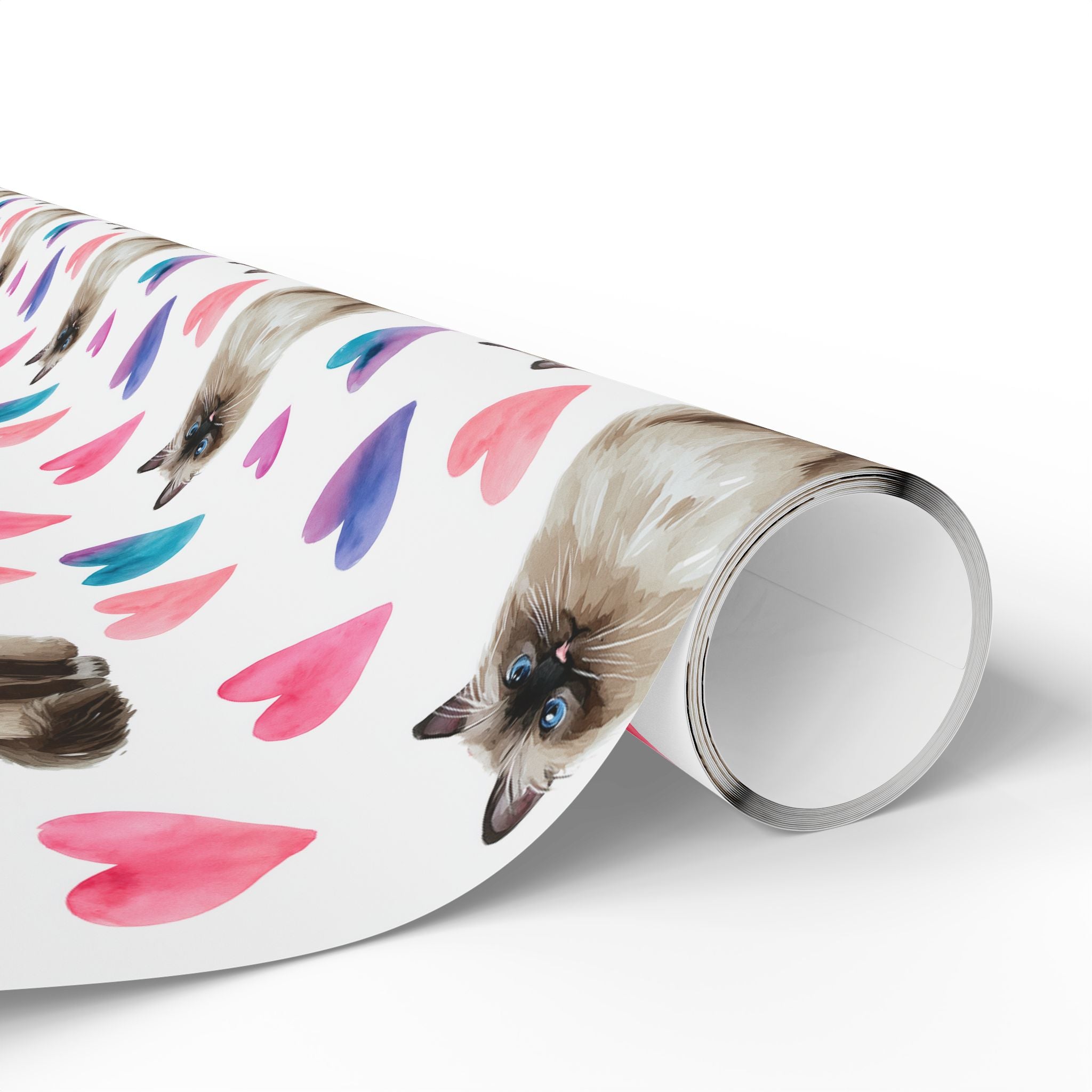 Silkwhisper Love – Watercolor Birman Cat with Pink Heart Wrapping paper