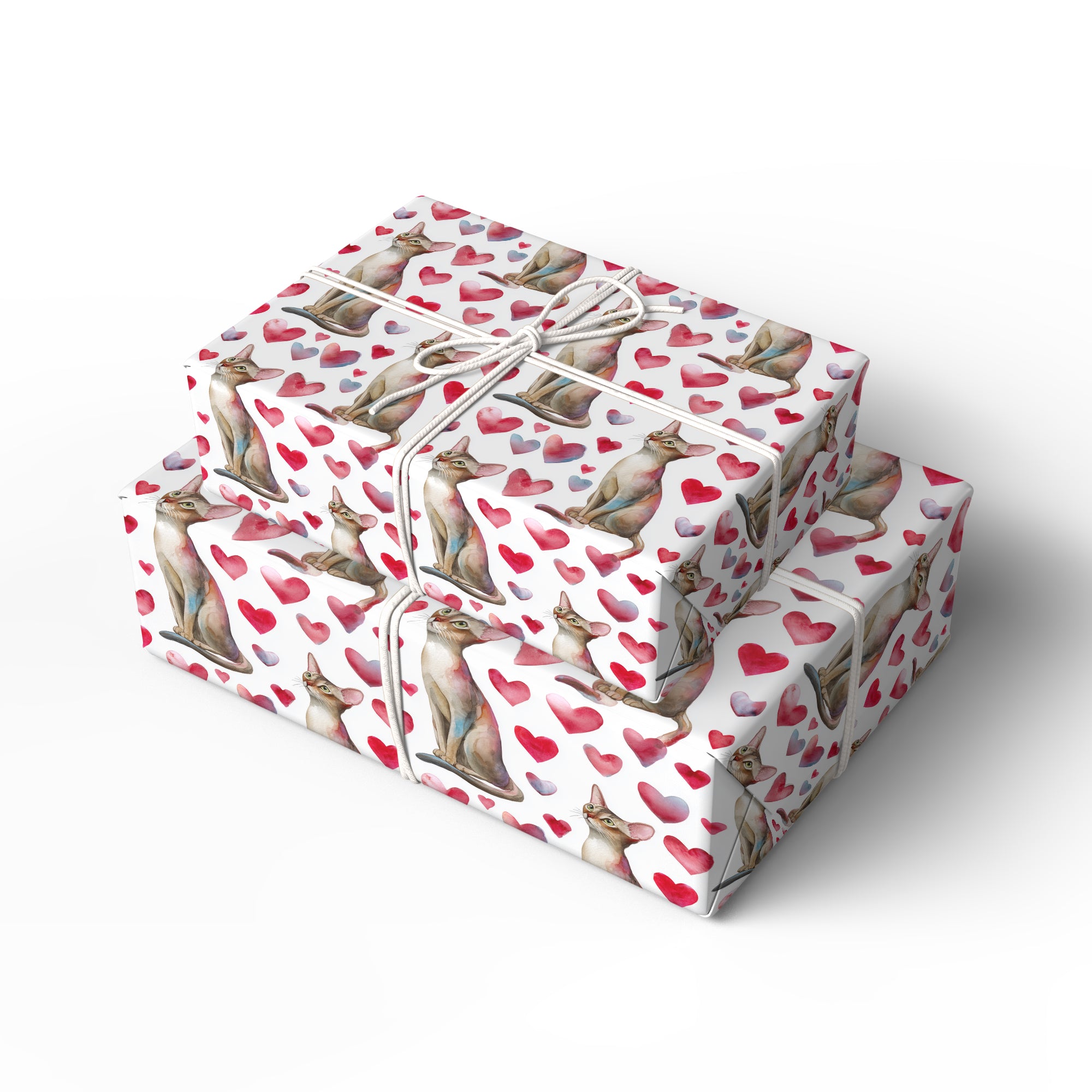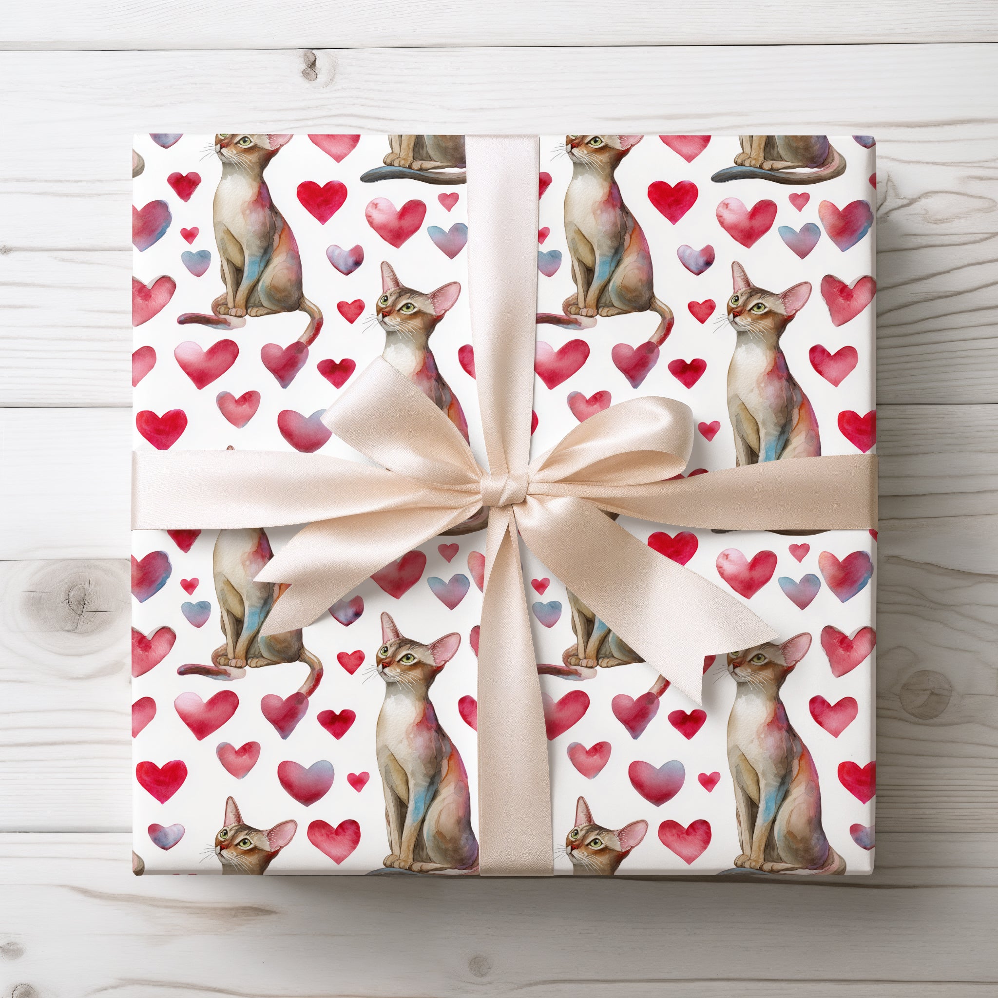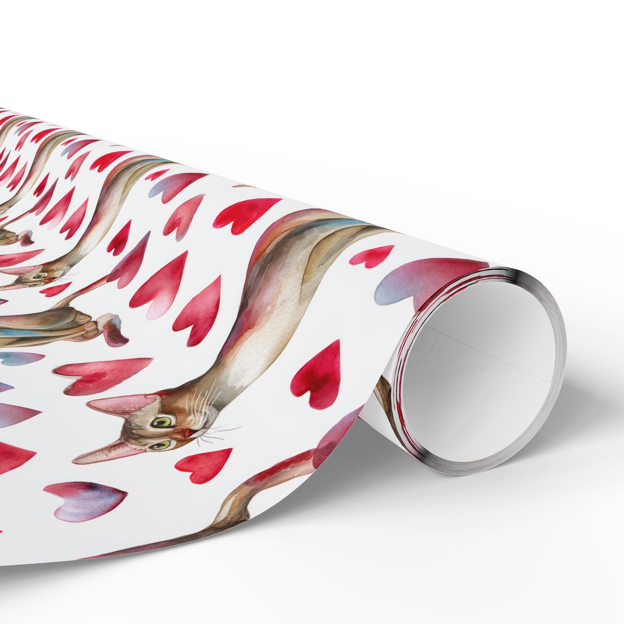 Velourpaw Romance – Watercolor Abyssinian Cat with Pink Hearts Wrapping Paper