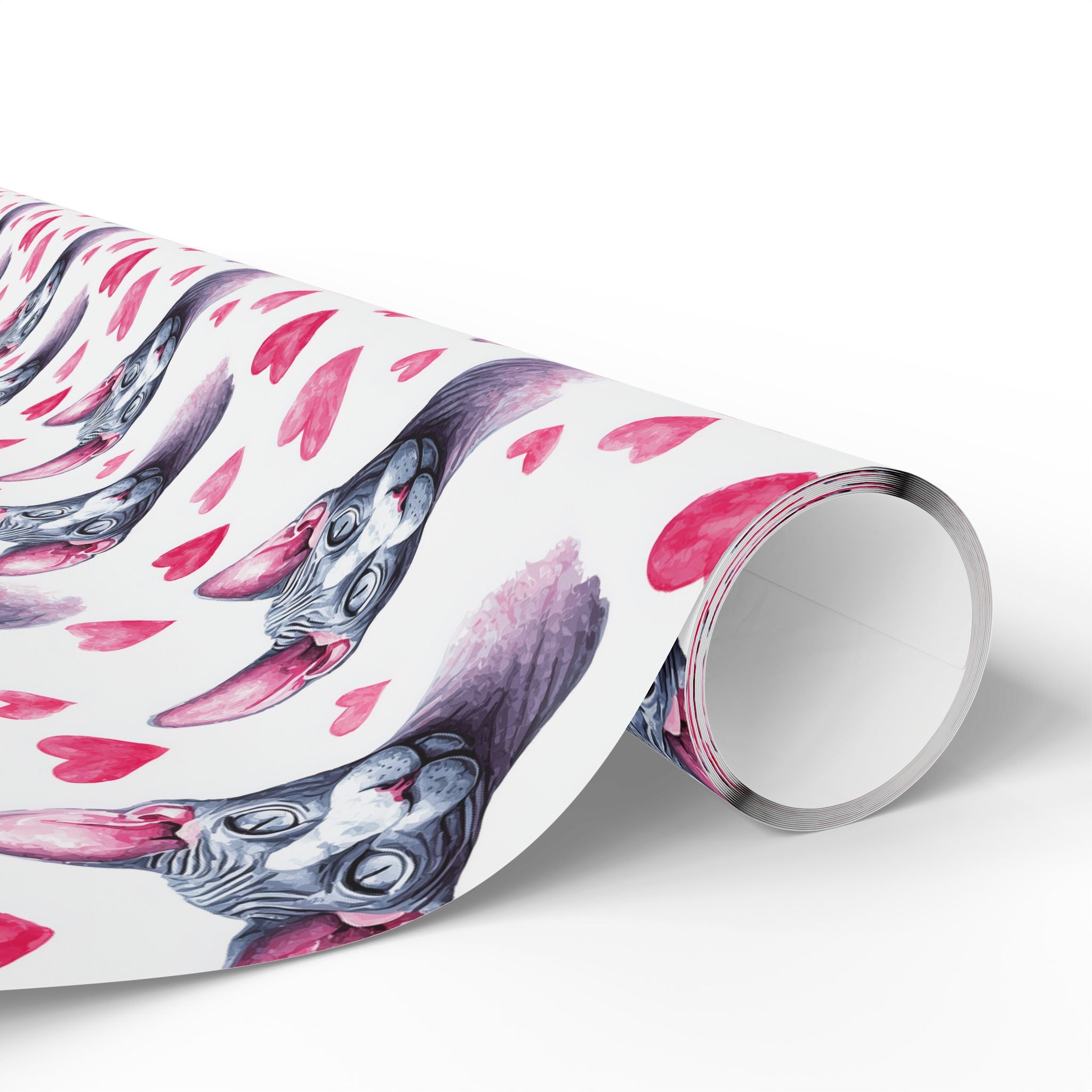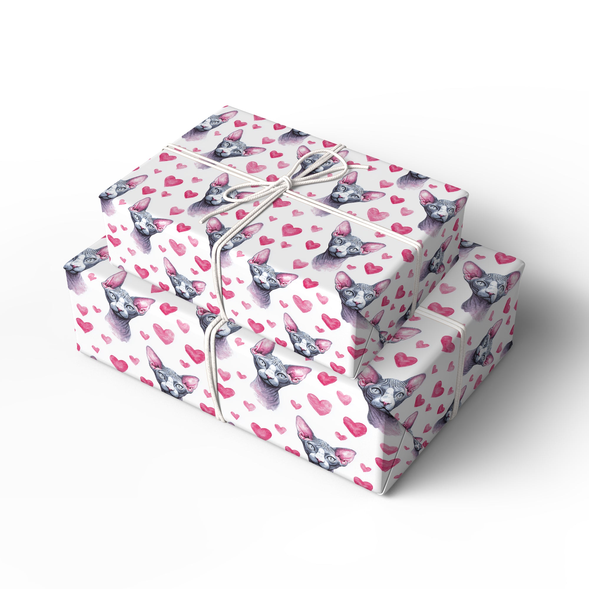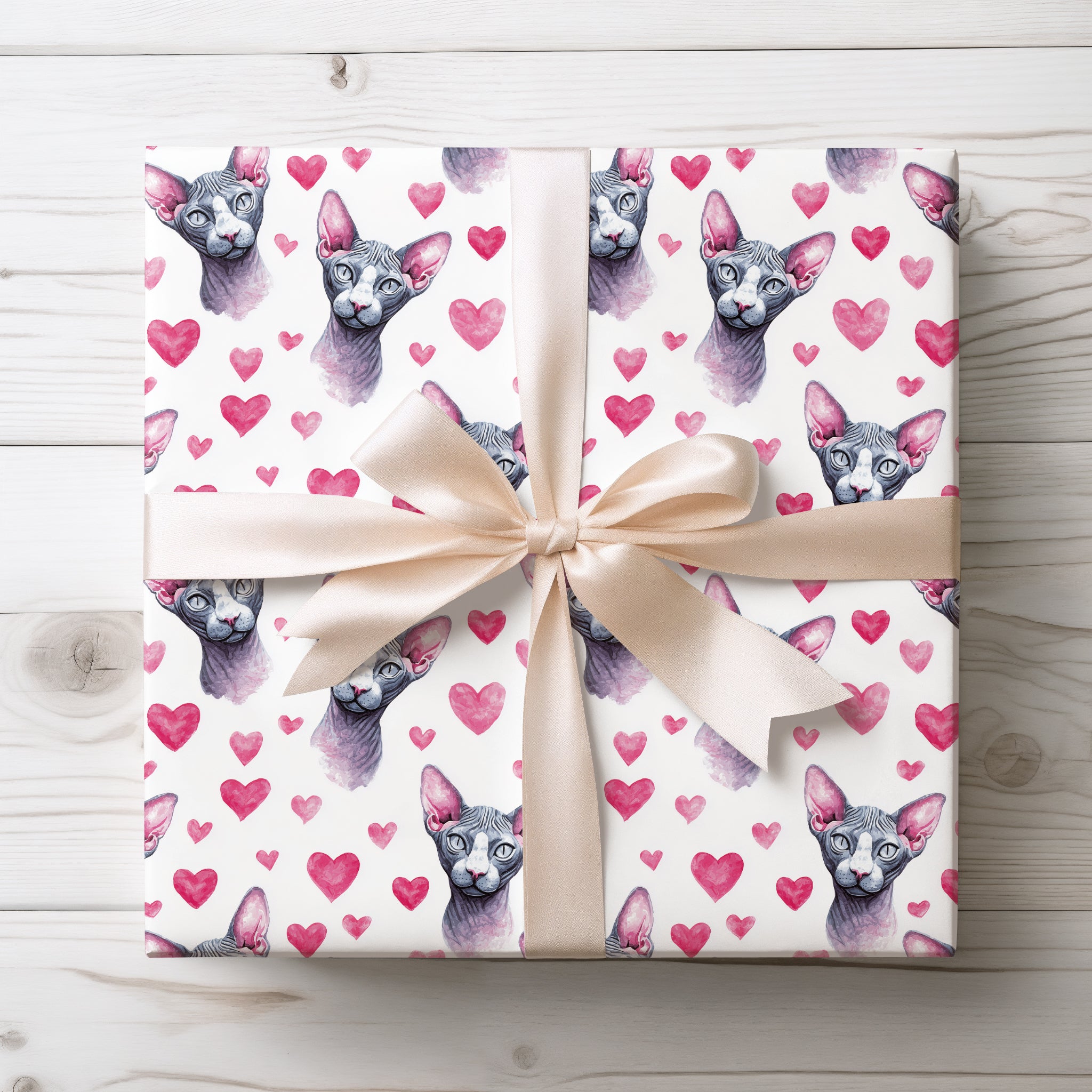 Velvheart Sphinx – Watercolor Sphynx Cat with Pink Hearts wrapping paper